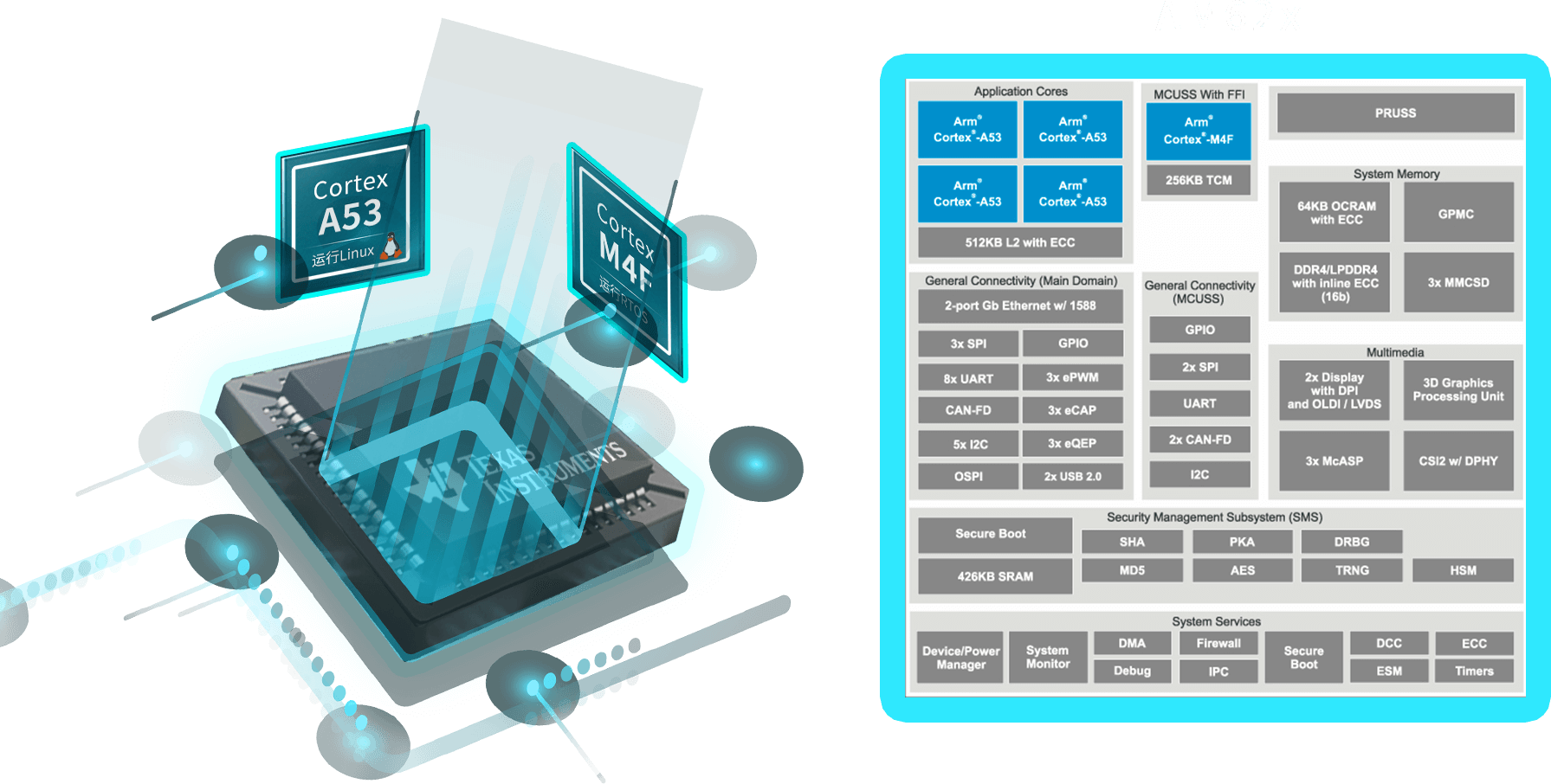AM62x是一顆多核異構(gòu)處理器,采用Cortex-A53+Cortex-M4F的處理核+控制核架構(gòu)組合; 可通過M4F內(nèi)核及其專用外設(shè)實(shí)現(xiàn)功能安全特性,并且M4F內(nèi)核的啟動(dòng)和運(yùn)行不再依賴A53內(nèi)核。